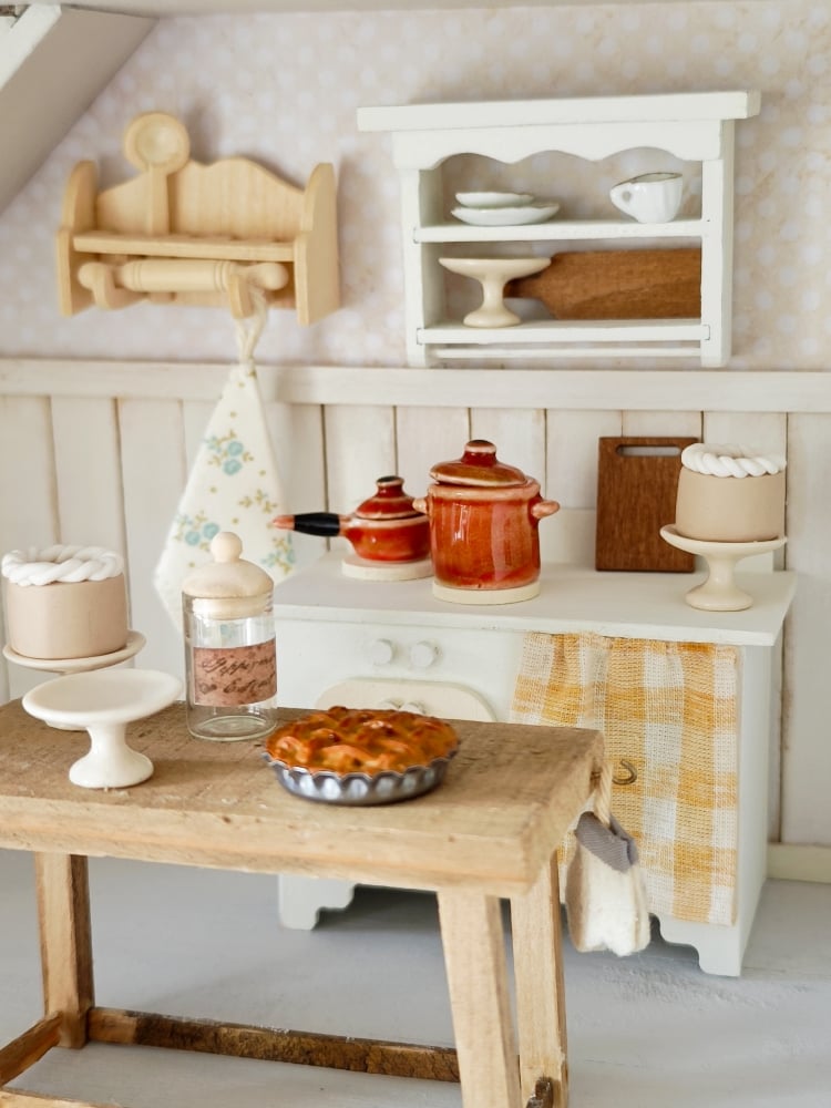 A ceramic pie dish with pie for a 1/12 scale dollhouse, ideal size for 11-15 cm Maileg mice