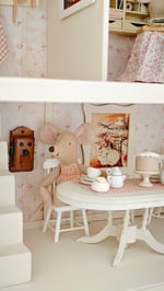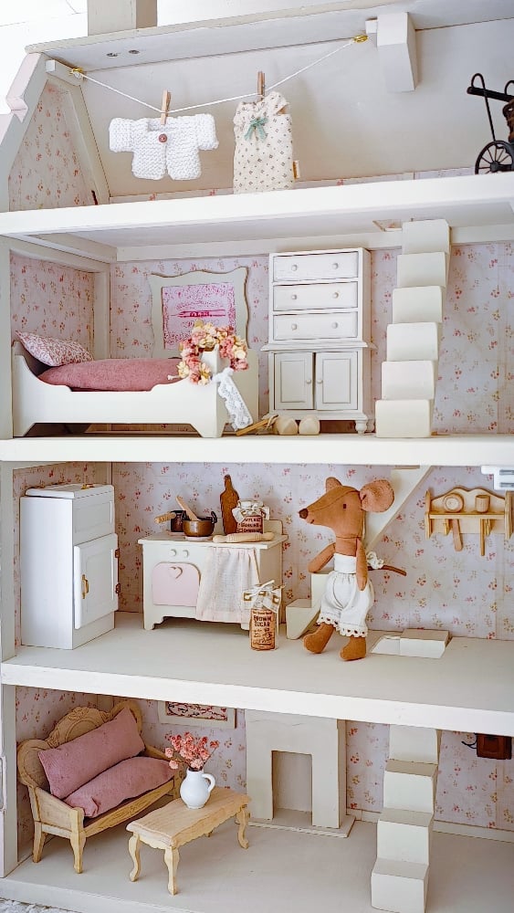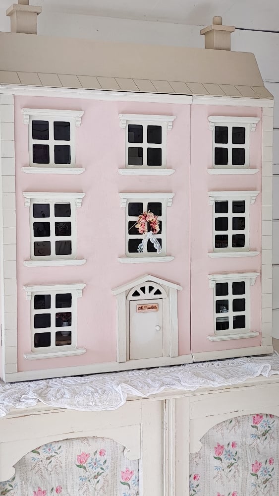 Descubre esta hermosa casa de muñecas en un delicado tono rosa, una creación única diseñada con atención al detalle. Con varias habitaciones iluminadas por ventanas, su estilo clásico y elegante incluye techos a dos aguas y una acogedora entrada.